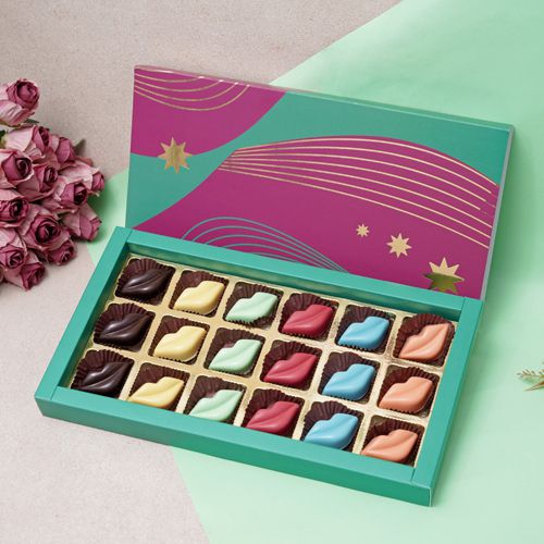 This gift box has: � 18 pcs Lip Shaped Chocolates (Flavors - Almond, Butterscotch, Cashew, Cranberry, Blueberry, Orange Crisp)