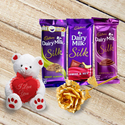 Buy this Chocolate N Teddy Delight Gift Hamper for your loved ones to let them know just how much they matter to you. This Gift Hamper consists of goodies such as 3 Bars of Cadbury Dairy Milk Silk Chocolates (60 gms each) in three different flavors of Roasted Almond, Fruit N Nut and Chocolate along with a Happy Birthday Singing Teddy and 1 Golden Rose.