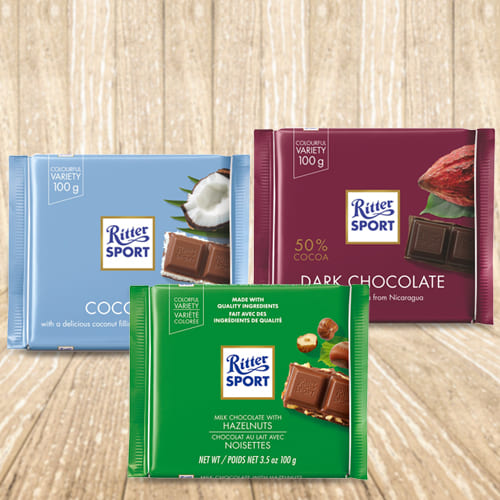 Bring smiles on the faces of your dear ones with this gift of exclusive Pack of 3 Assorted Chocolates from Ritter Sport (Hazalnut, Coconut, Dark Chocolate) and make your bond stronger.