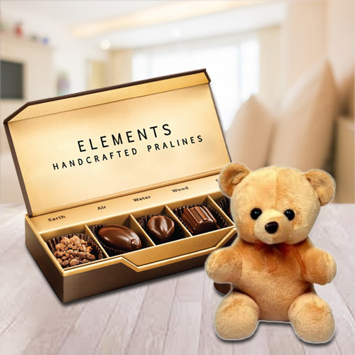 Send this surprise gift of Tempting Element Chocolates from ITC (5 pcs Premium Chocolate Box) with a Small Teddy (6 in) to your special one and make him/her smile.