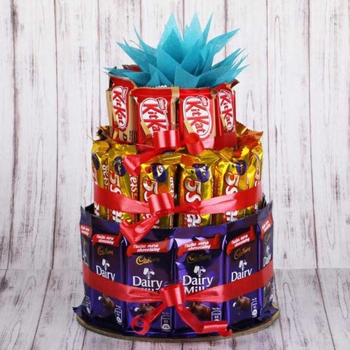Deliver this amazing gift of Marvellous 3 tier Arrangement of Chocolates to deliver happiness into the lives of the people you love. This Arrangement consists of 12 Cadbury Dairy Milk (13 gms each), 12 Cadbury Five Star (22 gms each) and 10 Nestle Kitkat (13 gms each).