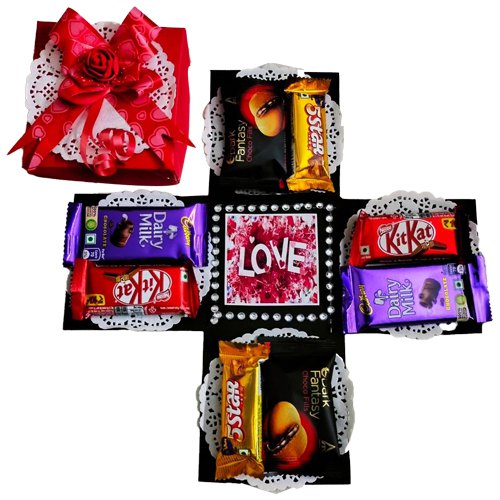 This single layer chocolate explosion box contains: � 2 Pcs Cadbury Dairy Milk Bar (13g) � 2 Pcs Nestle KitKat (10g) � 2 Pcs Cadbury Five Star (10g) � 2 Pcs ITC Dark Fantasy Choco Fill Cookies (15g)
