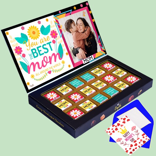 Send this Fantastic Assorted Handmade Chocolates Gift to make you mom forget all her sad memories on this Mothers Day. This is a gift of Premium 18 pieces Assorted Flavor chocolates with Personalized Name - Photo and Mothers day theme Digital Print On box and on Chocolates With Combo Greetings Card.