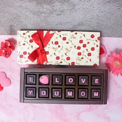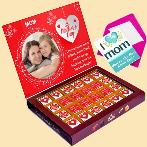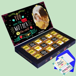 Details: a) Chocolate (24 pieces, Flavors: Roasted Dry Fruit Filling , Cranberry Filling, Paan Filling, Butterscotch Filling, Mix Fruits Filling, Chocochip Filling) b) Has a Greetings Card c) Personalization: Your personalized Photo N Name which need to be Put on box Top N on Chocolate d) Theme: Mothers Day e) Shelf Life: 3 Months