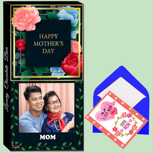 Amaze your mother by sending her this Customized Mothers Day Chocolate Gift and make her crave for more on this day. This is a gift of Premium 100 Grams Assorted Flavor chocolate Bar with Personalized name - Photo N Mothers day Theme Digital Print Along with Greetings Card Combo.