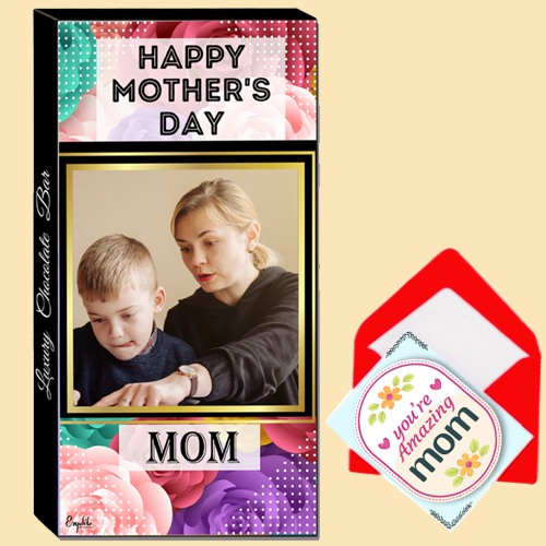 Merge your love with this Floral Print Mothers Day Photo Chocolate Bar to send your heartfelt wishes to your mother on this day. This is a gift of Premium 100 Grams Assorted Flavor chocolate Bar with Personalized name - Photo N Mothers day Theme Digital Print Along with Greetings Card Combo.