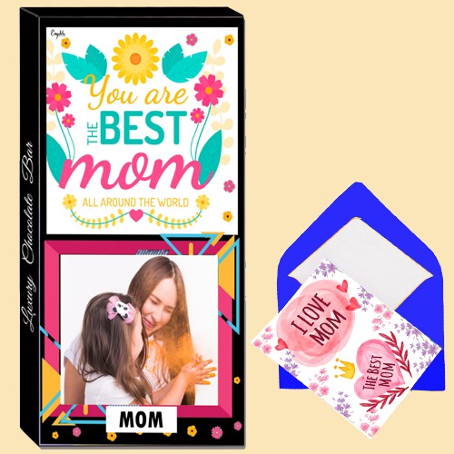 Celebrate Mothers Day in style with this Personalized Heartfelt Chocolaty Wishes and win the heart of your mother. This is a gift of Premium 100 Grams Assorted Flavor chocolate Bar with Personalized name - Photo N Mothers day Theme Digital Print Along with Greetings Card Combo.