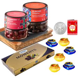 Transport yourself back to the magical nights of Diwali with our delightful Diwali Cracker Chocolate Box. Designed to evoke nostalgic memories of playing with crackers, this exquisite chocolate assortment is a true delight for chocolate lovers. The mouthwatering chakari, with its crispy almond florentine base, is a reminiscent of the beautiful sparklers that once captivated your childhood eyes.Indulge in the almond chocolate rocks, crafted with utmost care to resemble the stones that adorn firecrackers. These perfectly balanced treats combine the richness of chocolate with the crunch of almonds, creating a harmonious dance of textures in your mouth.The laxmi bombs, infused with chocolate granola, pay homage to the sound and spectacle of bursting fireworks. Close your eyes and savor the irresistible blend of creamy chocolate and crunchy granola, which will transport you to fond memories of the lit skies on Diwali night.Light up your taste buds with the diya-shaped chocolate, a symbol of the divine light that illuminates homes during Diwali. Our skilled chocolatiers have crafted this delicate piece with precision, ensuring it captures the essence of the festival in both taste and design. No Diwali celebration is complete without the crackling sound of anar, and our chocolate version is no exception. The irresistible blend of butterscotch and chocolate delivers a burst of flavors that will leave you craving for more. To add a touch of elegance, our assortment features lavangi, both in plain dark and milk chocolate. These smooth and decadent treats are reminiscent of the dark night sky illuminated by bursts of colorful crackers.And finally, our roasted almond bombs are a delightful symphony of chocolate and almonds.