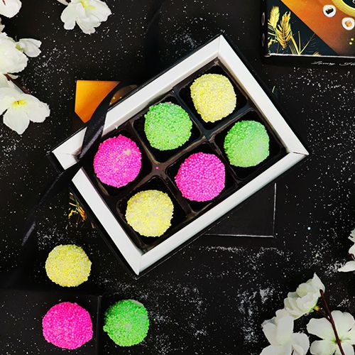This gift box has: � 6 pcs Assorted Truffle Chocolates with Coconut Fillings Inside (20g each)