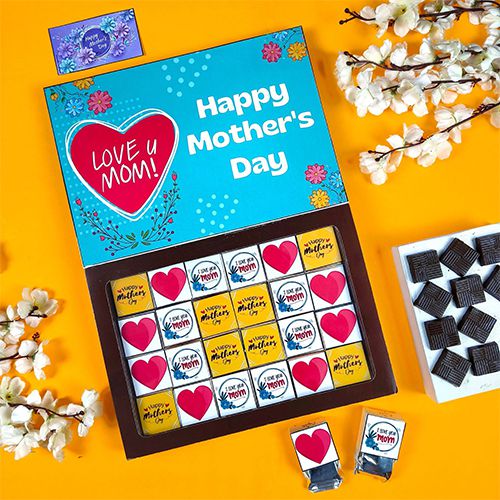 Surprise Mom with our Love You Mom Chocolate Treats Box! Inside, shell find 24 pieces of assorted flavor chocolates, each adorned with a charming Mothers Day theme digital print on both the box and the chocolates themselves. From classic favorites to unique delights, each chocolate is a sweet token of your love and appreciation. Alongside these delectable treats, shell discover a heartfelt Mothers Day greetings card, awaiting your personal message to express your deepest gratitude and affection. Make Moms day extra special with this thoughtful and delicious gift box, sure to bring joy and sweetness to her heart.