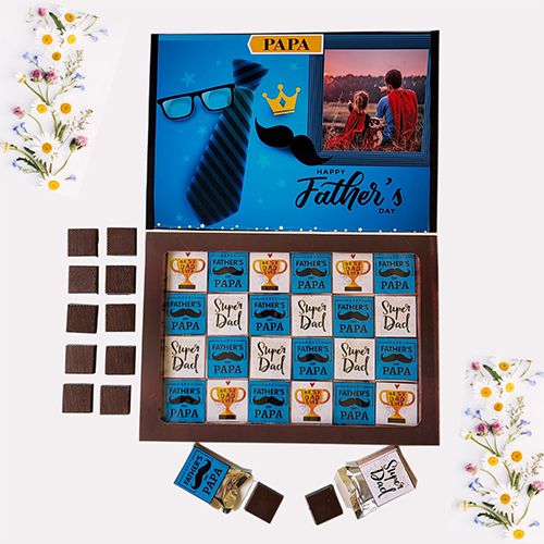 This gift box contains: � 24 Pcs Fathers Day Themed Flavoured Chocolates with Personalized Name and Photo (Roasted DryFruit Filling, Cranberry Filling, Paan Filling, Butterscotch Filling, Mix Fruits Filling, Chocochip Filling)