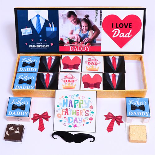 This gift box contains: � 12 Pcs Fathers Day Themed Flavoured Chocolates with Personalized Name and Photo (Roasted DryFruit Filling, Cranberry Filling, Paan Filling, Butterscotch Filling, Mix Fruits Filling, Chocochip Filling)