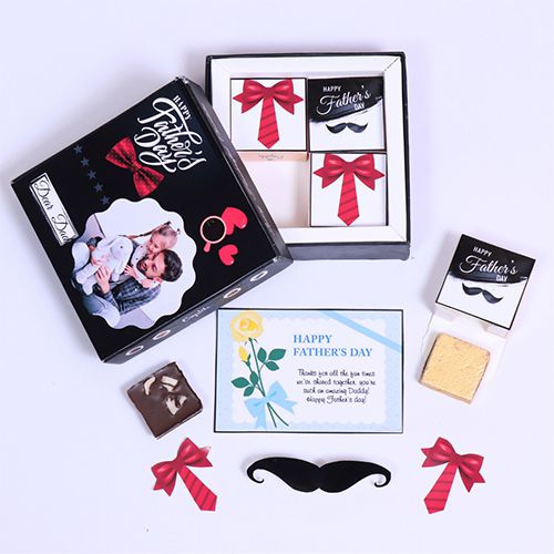 This gift box contains: � 4 Pcs Fathers Day Themed Flavoured Chocolates with Personalized Name and Photo (Roasted DryFruit Filling, Cranberry Filling, Paan Filling, Butterscotch Filling, Mix Fruits Filling, Chocochip Filling)