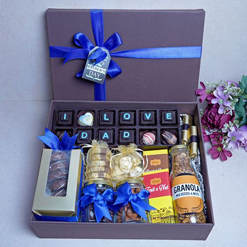 Spoil Dad with our Heartfelt Chocolate Treats Hamper, brimming with an irresistible assortment of gourmet delights. Indulge his sweet tooth with the rich flavors of Oreo, Cranberry, and Orange Crisp Chocolates, each a mouthwatering treat. Delve into the sumptuous Cranberry Truffle, Orange Soft Filled Chocolate, and Heart Shape White Chocolate for a creamy delight. Enjoy the velvety Milk Truffle Chocolate and assorted Chocolate Logs for a decadent experience. Accompanying these delights are ten assorted Cookies, Almond Chocolate Florentines, and Almond Chocolate Rocks for a satisfying crunch. Complete the feast with our Fruit and Nut Chocolate Bar, Oreo Chocolate Bar, and nutritious Almond Cranberry Granola. Treat Dad to a gourmet experience he wont forget.