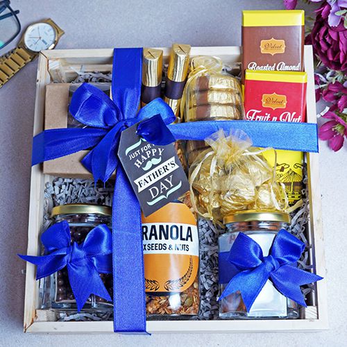 Surprise Dad with our Indulgent Chocolate Treats Hamper, filled to the brim with a delightful assortment of treats. Dive into five scrumptious assorted Cookies, each bursting with homemade flavor. Indulge in the richness of two assorted Chocolate Logs and savor the crunch of six Almond Chocolate Florentines. Treat his taste buds to the sweetness of our Fruit and Nut Chocolate Bar and the nutty goodness of our Roasted Almond Chocolate Bar. Enjoy the satisfying crunch of six Almond Chocolate Rocks and indulge in the sweetness of Chocolate Coated Raisins and Almonds. Complete the experience with our wholesome Almond Cranberry Granola, making this Fathers Day celebration truly unforgettable.