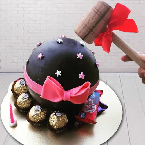 Delight your loved ones with this Designer Round Smash Cake with Hammer n Chocolates and make them realize how special they mean to you. This Gift Combo comes with 1/2 kg Round Smash Cake, 4 pcs Ferrero Rocher Chocolate, Nestle Kitkat N Cadbury Dairy Milk Chocolate Bar.