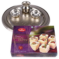 Send this Haldiram Soan Papdi with Silver Plated Puja Thali (Size: 5-6 inch Weight:0.98gm approx) to your loved ones.(Soan Papdi 400 grms.)