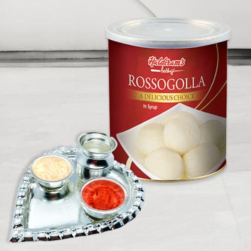 This gift set has: � Haldirams Rosogolla (500g) � A Silver Plated Paan Shaped Aarti Thali (size 3-4 inches)