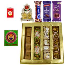 1 Kg. Soan Papri from Haldiram in a Silver Plated Thali with Free Silver Plated Lakshmi Ganesh Coin. Note: Gross Weight applies for Sweets. Thali Size: 5-7 inch. (Weights are Gross Weight)