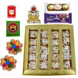 Diwali Pooja Samagri Hamper containing Mandapam, Pooja Samagri Kit, Thali with 500 Gms. Mixed Dry Fruits (Cashew ,Raisins, Almonds and Apricots) and 500 Gms. Haldiram Ladoo with free Silver Plated Lakshmi Ganesh coin. Note: Mandap Size 2.5 inch, Thali Size 8 to 9 inch. Gross weight applies for Sweets and Dry Fruits.