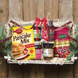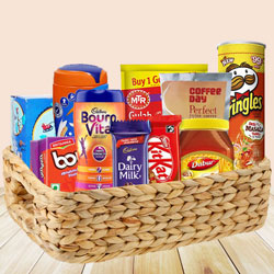 Send online this Classic Holiday Christmas Gift Hamper to your special one and express your love. This Gift Hamper is presented with a Bisk Farm Christmas American Fruit Cake, 1 Pack of Assorted Eclairs and Melody, a Packet of 400gm Alpenliebe, a Pack of Herbal Tea, a Britannia Cake, 18Pcs Handmade Chocolates, OREO and Treat Biscuits, a Bottle of Appy Grappo, a Candle, Unibic Cookies, Chocolate Syrup, 3Pcs Waffey Wafers and Cup Cakes in a Cane Basket.