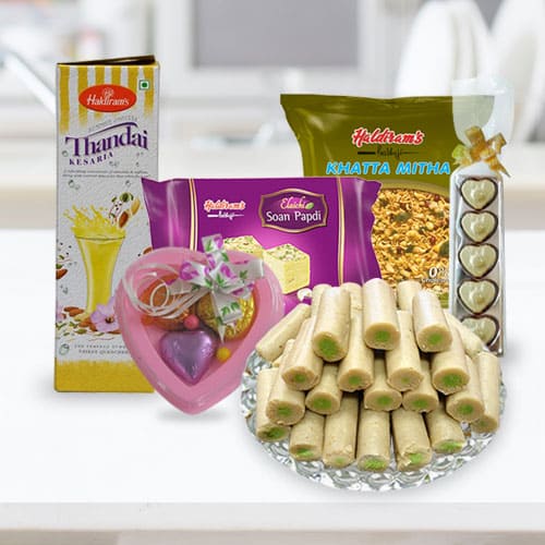 This gift set has: � Haldirams Soan Papdi (250 gm) � Haldirams Khatta Meetha Mixture (250 gm) � Haldirams Kaju Pista Roll (250 gm) � Haldirams Thandai Bottle (750 gm) � 5 pcs Homemade Chocolates � 3 pcs Homemade Chocolates in a Heart Shaped Box.