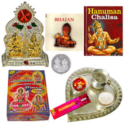 This Combo comprises of � A Ganesh Lakshmi Mandap � A Free Silver Coin � A Pan Thali � A Hanuman Chalisa Book � A a Bhajan Music CD � And Agarbati Packet � Roli-Tika � Other Puja Samagri.