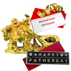 Fathers Day Gift Hamper of Laughing Buddha for Luck, special Happy Fathers Day Chocolate & Shoppers Stop E Voucher worth Rs 1000.
