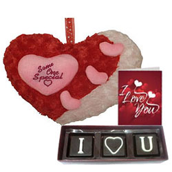 Win the hearts of your dear ones by sending this eye-catching I Love You Hamper and show your fondness. Send love filled wishes with this gift of I Love You Hand Made Chocolate, Love Card N Heart Shaped Cushion.