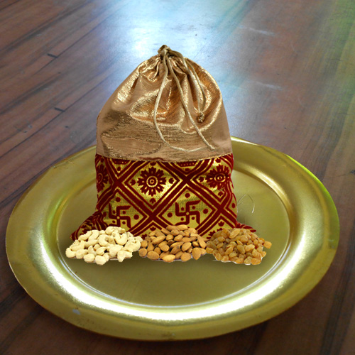 Send surprises as a gift of Delectable Mixed Dry Fruits Potli with Decorated Thali in Gold Color to the persons close to your hearts. This ethical Hamper is a thoughtful gift as it contain a delicious combination of 450 gr. Dry Fruits like Cashew, Raisins and Almond.