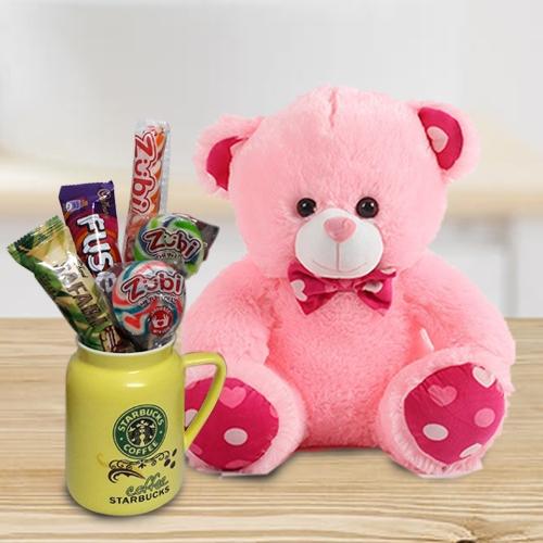 Surprise your special ones by sending this New Year Gift of Candies n Chocolates with 6 inch Teddy and spread love and happiness around. This combo has - 1) 6 inch Teddy 2) Starbuck Coffee Mug 3) 3 pcs Zuby Candies 4) Safari Chocolate Bar 5) Cadbury Fuse