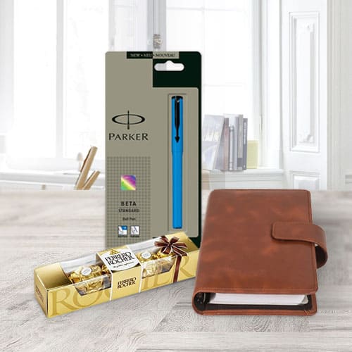 Click to deliver this gentle Gift Pack of Planner Dairy with Pen N Chocolates that delivers happiness instantly when unwrapped. This fantastic Gift will be an unforgettable corporate gift as it contain a nice Planner Dairy, Parker Beta Pen and 4 pcs Ferrero Rocher Chocolates.