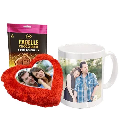 This gift set has: � A Personalized Heart Shaped Cushion � A Personalized Coffee Mug � A Pack of Fabelle Choco Deck Mini Delights (163 gm)