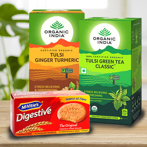 This gift set has: � Organic India Tulsi, Ginger N Turmeric Tea � Organic India Tulsi Green Tea (25 bags each) � Mc Vitties Digestive Cookies (66 gm)