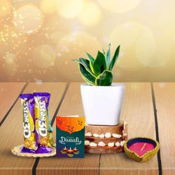 Celebrate the festive season with your family and friends. Send them this Exclusive Diwali Hamper of Goodies. This Hamper comes with- 1. Cadbury Temptation Rum N Raisin (72gms) 2. Cadbury Temptation Almonds (72gms) 3. Planner Diary 4. Parker Standard Beta Pen 5. Visiting Card Holder 6. Richborn Gents Leather Wallet (Black, Multi Pocket) 7. A 2 tier Lucky Bamboo Plant 8. Antique Ganesh Laxmi Mandap 9. 5 pcs Tea Light Wax Candles 10. Wooden Tray