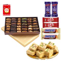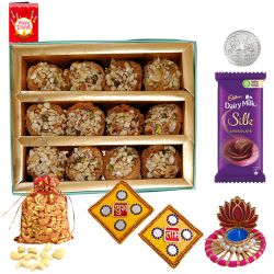 Create a beautiful world for your loved ones by sending this Marvelous Sweets n Chocolates Hampers with Diya N Ganesh Laxmi Mandap wrapped up in the essence of your love and warm feelings. This Hamper arrives with- 1. Assorted Indian Sweets from Bhikaram (gross wt: 500gms) 2. Assorted Cadbury Chocolates (126 gm) 3. Antique Ganesh Laxmi Mandap 4. Decorative Subh Labh Wall Stickers 5. 6pcs Decorated Mud Diya 6. Free Silver Plated Ganesh Laxmi Coin