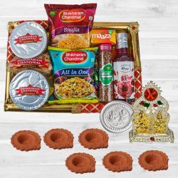 Celebrate the festive season with your family and friends. Send them this Wonderful Diwali Assortment Gift Tray from Bhikaram for Festival of Lights. This Gift Hamper contains- 1. Bhikaram Diet Chirwa (200 gm) 2. Bhikaram Mini Samosa (200 gm) 3. Bhikaram Assorted Mithai (400 gm) 4. Bhikaram Bhujia (200 gm) 5. Jabson Mini Bhakarwadi (160 gm) 6. Bhikaram Chatpata (200 gm) 7. Cadbury Eclairs (10 pcs) 8. 6 pcs Designer Diya 9. Free Laxmi Ganesh Silver Plated Coin 10. A Decorated Tray