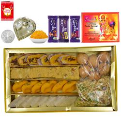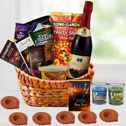 Bring the people you love closer to your heart by gifting this Remarkable Diwali Assortment Gifts Hamper loaded with your affection and fondness for them. This Hamper arrives with- 1. Imported Lindt Excellence 85% Cocoa Bar (100 gm) 2. Cadbury Bournville Rum and Raisins (80 gm) 3. Toblerone Milk Swiss Chocolates with Honey n Nugget (100 gm) 4. Cornitos Nacho Crisp (60 gm) 5. 12 pcs Ferrero Rocher Chocolate Moments (69.6 gm) 6. Fox Mint Candy Pouch Pack (90 gm) 7. Unibic Chocolate Chip Cookies (150 gm) 8. Diwali Greetings Card 9. Antique Ganesh Laxmi Mandap 10. 3 Tier LED Lamp 11. Cane Basket