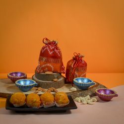 Celebrate Diwali with your loved ones. Gift them this Marvelous Diwali Gift of Ferreo Rocher Chocolate with Dry Fruits, Aroma Candle n Ganesh Idol and make them feel your presence on this festive day. This Hamper arrives with - a) 24 pcs Ferrero Rocher Moments Chocolate (139.2 gms), b) 200 gm Dry Fruits kept in a designer potli bag, c) Decorated Vignesh Ganesh Idol in a transparent case, d) Aromatic Pillar Candle from Iris, e) 6 pcs Designer Diya and f) Free Silver Plated Laxmi Ganesh Coin.
