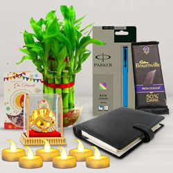 Treat your special people in an exclusive way with this Marvelous Diwali Corporate Gifts Hamper and make them feel very special on the occasion. This Hamper comprises of- 1. A Planner Dairy 2. A Parker Beta Pen 3. 4 pcs Ferrero Rocher Chocolates 4. A Money Plant in Plastic Pot 5. Antique n Auspicious Ganesh Laxmi Mandap