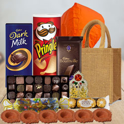 Amaze your loved ones by gifting them this Exclusive Chocolates Arrangement for Diwali Gift and make them crave for more on this Diwali. This Hamper arrives with- 1. 12 pcs Cadbury Dairy Milk (13 gms each) 2. 12 pcs Cadbury Five Star (22 gms each) 3. 10 pcs Nestle Kitkat (13 gms each) 4. Pious Subh Labh Wall Stickers 5. 2 pcs Flying Lanterns 6. 6 pcs Designer Diya