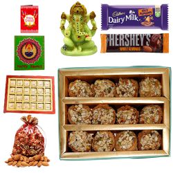 Send this Gift Hamper of Tasty Assorted Diwali Sweets from Bhikaram with Diya. This delightful sweet platter (gross wt. 1 kg) has 6 pcs Balusahi, 6 pcs Nariyal Laddu, 6 pcs Boondi Laddu, 12 pcs Kaju Katli, 500 gm Gulab Jamun from Bhikaram and 6 pcs Designer Mud Diya for your dearest ones and make them happy.