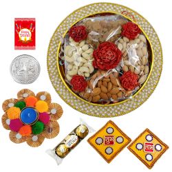Gift this Exclusive Diwali Snacks Time Dry Fruits Platter with Diya n Free Coin. This combo has Dried Apricots, Dried Prunes, Dates, Roasted Almonds, and Cashews in a wooden tray (Gross wt: 1kg) with 6 pcs Designer Diya n Free Silver Plated Ganesh Lakshmi Coin to your loved ones and spread happiness.