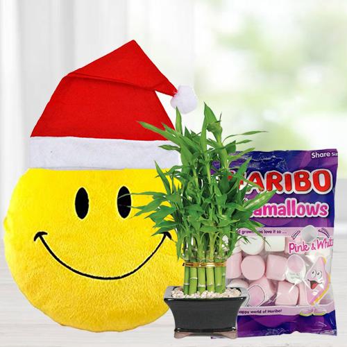 Feel great when you gift this Remarkable Assortments Gift Combo and bring joy into the lives of the people you love for wishing merry christmas. This Combo includes a Smiley Teddy with a Santa Claus Cap, Marshmelts Marshmello (140 g) N a 2 Tier Lucky Bamboo Plant.
