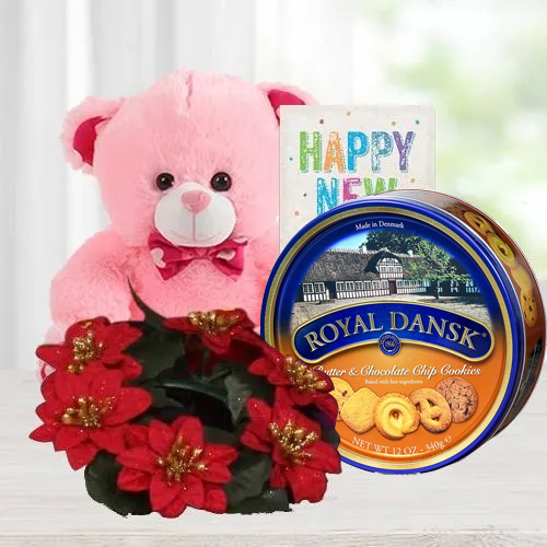 Bring the people you love closer to your heart by gifting this Amazing Royal Dansk Cookies (340 gms) N Assortments Combo loaded with your affection and fondness for them. This Combo comes with Royal Dansk Cookies (340 gms), a 6 inch Teddy, a decorated Wreath and New Year Card.