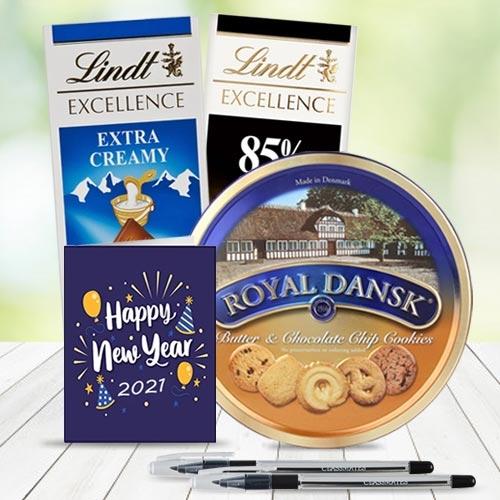 Create a beautiful world for your loved ones by sending this Yummy Chcocos N Cookies Combo for New Year wrapped up in the essence of your love and warm feelings. This Combo consists of Royal Dansk Danish Butter Cookies (400 g) with Lindt Excellence Extra Creamy (100 g), Lindt Excellence 85% Cocoa (100 g), 2pcs Ball Point Pen and New Year Card.