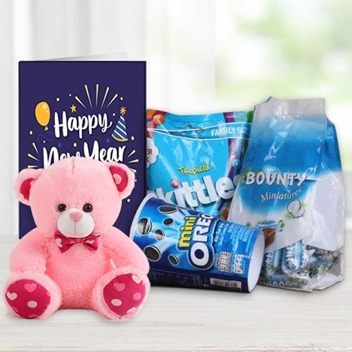 Deliver happiness by gifting this Delightful Chocolates N Soft Toy for Kids and wish merry New Year. This Combo features- 1. Bounty Miniatures Chocolate Pack (150 g) 2. Skittles Fruits Chocolate Pack (196 g) 3. Cadbury Mini Oreo (67 g) 4. 6 inch Teddy 5. New Year Greeting Card
