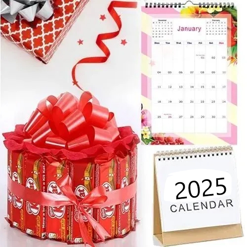 Merry New Year wishes are best delivered by gifting this Outstanding Kitkat Arrangement to your family and friends. This Arrangement consists of Round Shape Nestle Kitkat Arrangement (15 pcs x 12.8 gms each) neatly tied with a red ribbon. Wall Calender N Desk Calender is also added with it.