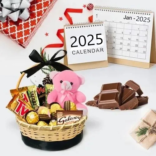 Create a beautiful world for your loved ones on New Year by sending this Amazing Chocolate Gift Basket wrapped up in the essence of your love and warm feelings. This Basket includes- 1) 2 x 4 pcs Ferrero Rocher 2) 2 pcs Twix (51 gms each) 3) Mars Miniatures (100 gms) 4) 2 pcs Saffari Bar (5 gms each) 5) 1 pc Galaxy Smooth Milk Bar 6) 6 inch Teddy 7) Desk Calender 8) Basket with handle and Bow