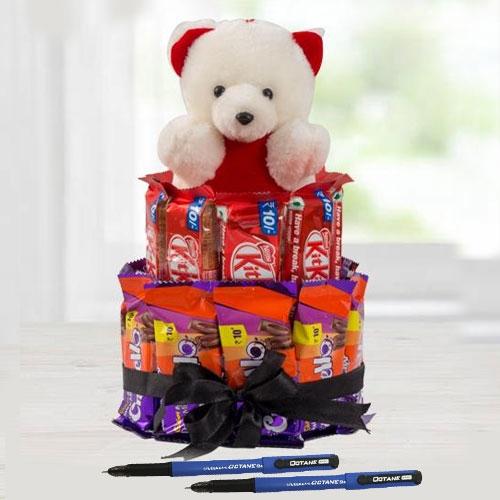 Deliver happiness by sending this Exquisite 2 Tier Chocos with Teddy Arrangement to make others happy on New Year. This Arrangement contains Nestle Kitkat (10gm x 10pc), Cadbury Crispello (10gm x 10pc) n a Cute Teddy (6in). It is also added with 6 inch Teddy n 2pcs Ball Point Pen.